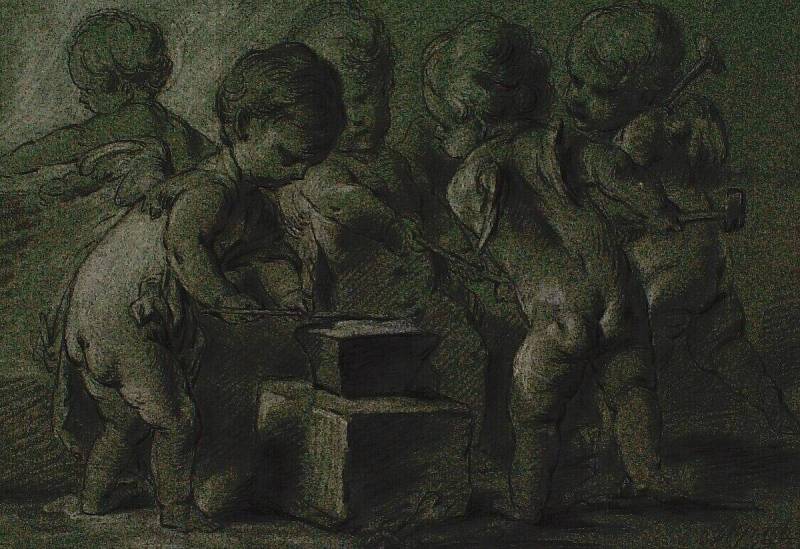 Vijf putti in een smidse voorstellende: het VUUR, eind 17de - begin 18de eeuw