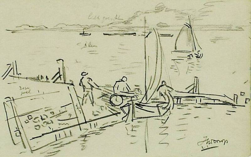 Krabbel van aanlegsteiger bij een rivier met enige scheepjes, circa 1910
