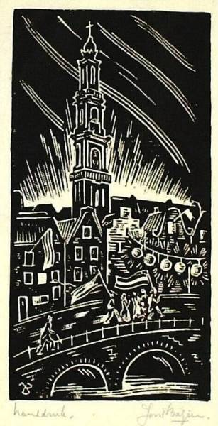 De Westertoren in Amsterdam met feestende figuren, 1945-1946