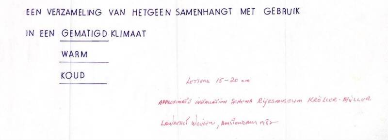 Installatieschema voor het Rijksmuseum Kröller-Müller van 'EEN VERZAMELING VAN HETGEEN SAMENHANGT MET GEBRUIK IN EEN GEMATIGD / WARM / KOUD KLIMAAT', 1982