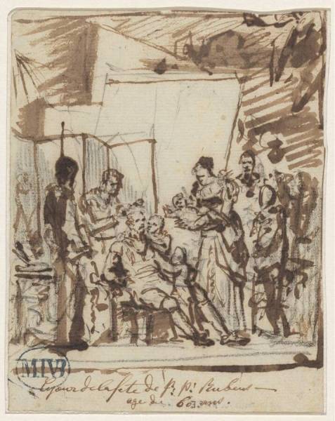 pen en penseel en bruine inkt over zwart krijt op papier