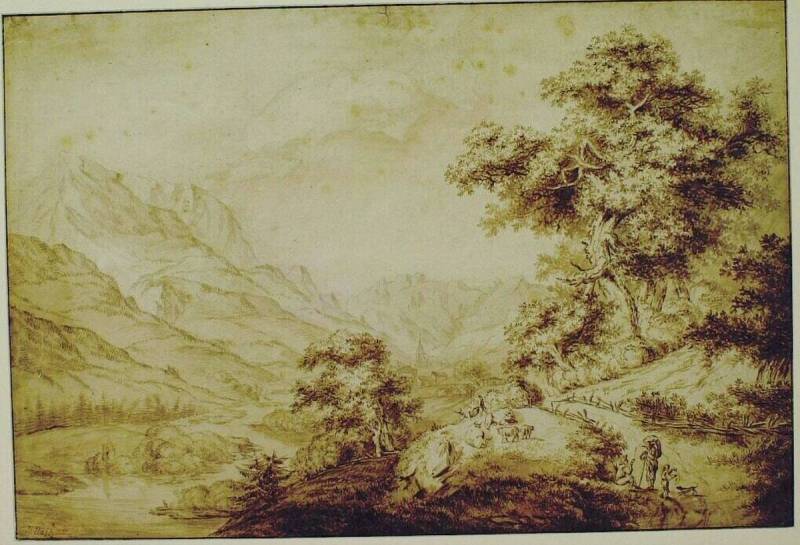 Berglandschap met een weg met figuren en vee bij een boomgroep, 18de eeuw