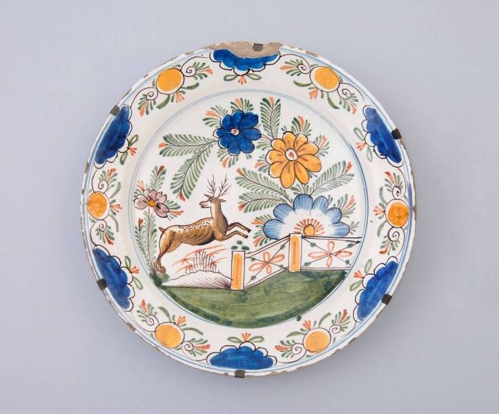 licht gebakken aarde, dekkende tinglazuur, wit en schildering op en onder het glazuur