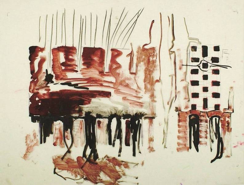 inkt (ballpoint), kleurpotlood, potlood en verf op transparant papier