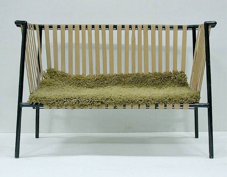 zitting en rug van gevlochten rubberband, zwart gespoten metalen frame, bekleed met een geknoopt kleed