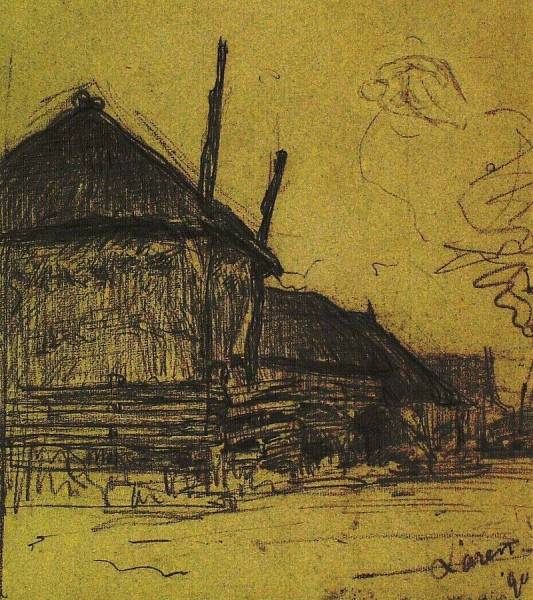 Hooimijt bij een boerderij te Laren (Krabbel van zittende vrouw), 1890