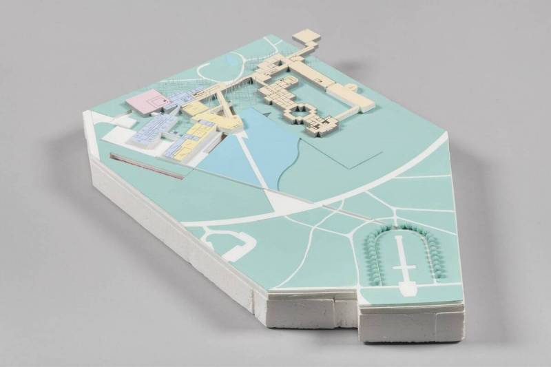 maquette van polystyreen, foamboard, verf, ijzerdraad, geprint papier