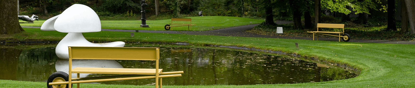 De beeldentuin van het Kröller-Müller is de perfecte plek om de Wheelbench zelf in alle rust te kunnen ervaren, of je nu met de bank aan de wandel gaat of er even rustig op gaat zitten. Juist hier, tussen kunst en natuur, ontstond het idee voor dit ontwerp.