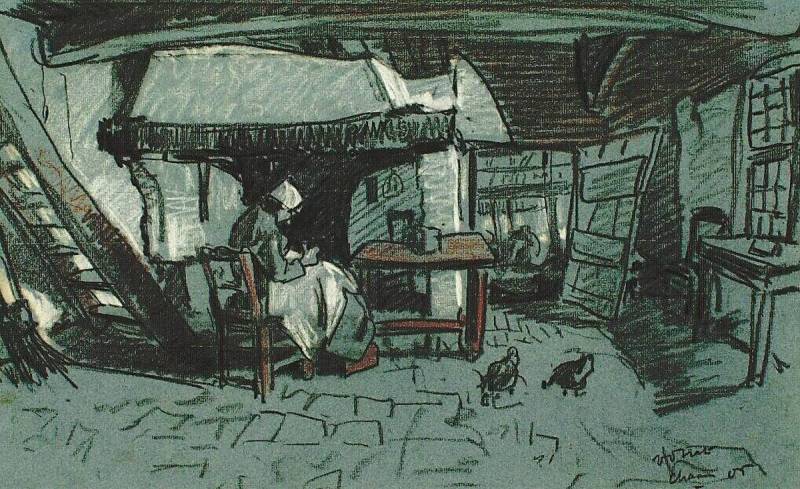 Vrouwtje bij schouw in de deel van een boerderij, 1905