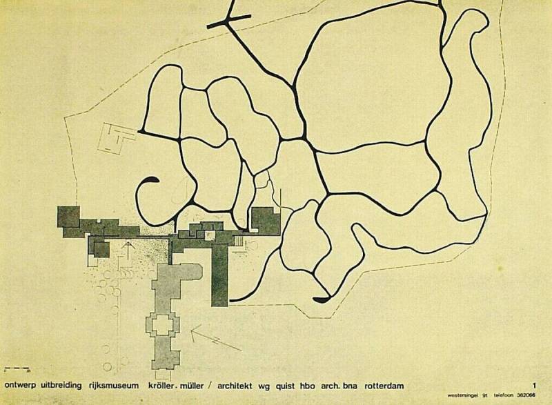 Ontwerp uitbreiding Kröller-Müller Museum: plattegrond museum en tuin, circa 1971