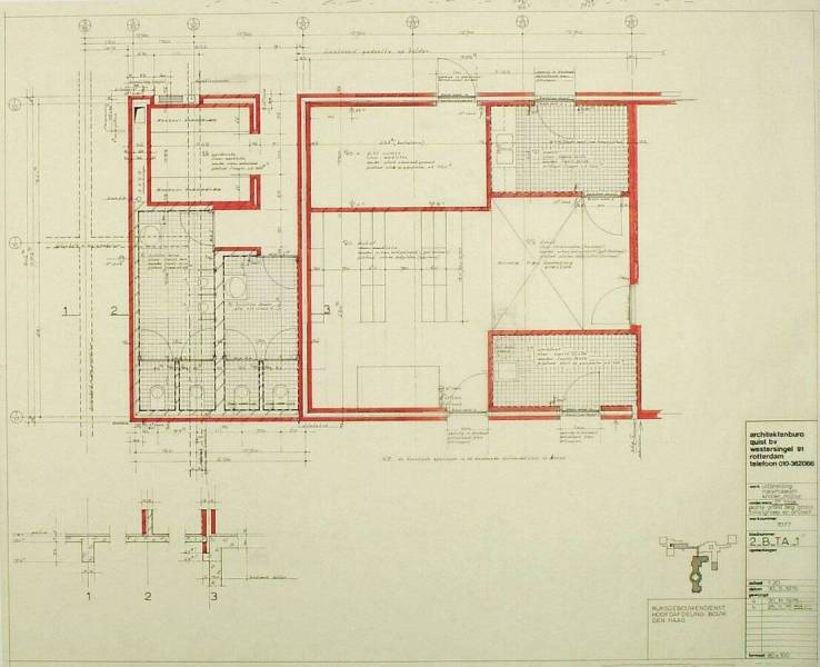 Plattegrond begane grond toiletgroep en archief, 30 mei 1975