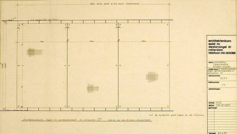 Uitbreiding Kröller-Müller Museum. Draadglaspanelen tegen garderobewand in stramien 17, 28 december 1971