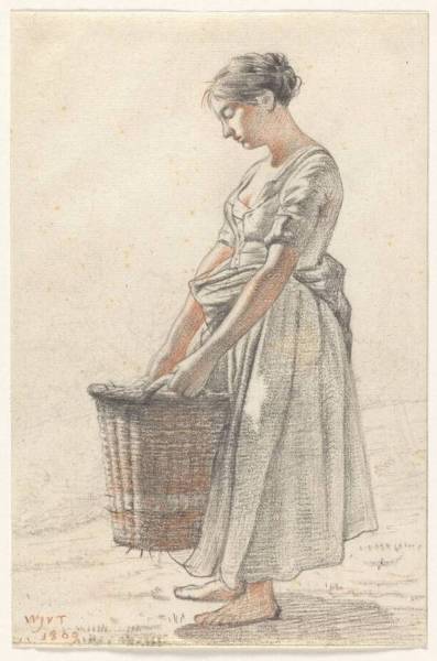 zwart en rood krijt op papier; kaderlijn in grafiet of zwart krijt